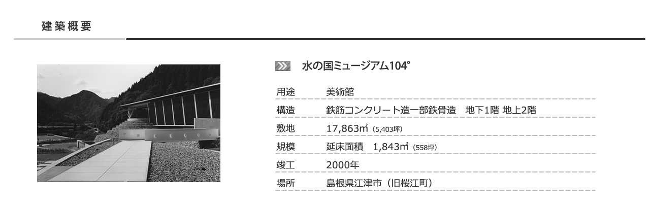『水の国ミュージアム104°』は島根県桜江町(現江津市)の委託による中山間地の小さな町の地域文化施設である。初期計画から建築、展示、ランドスケープの設計・監理および運営プログラムまで担当し、完成まで約8年近くにおよぶ仕事となった。